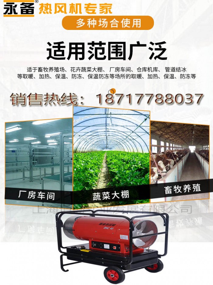 永备柴油热风机具有轻便、体积小、灵活、重量轻、热风功率大、操作简便、用电少,耗油省等特点,永备柴油热风机尤其对工商业场所和建筑桥梁等一些空间较大的场所能够发挥巨大的作用。柴油热风机作为工业新兴的一种空气采暖方式也是可以提供洁净干燥的热空气,对整个空间加热,温度均匀。它有着加热迅速,热量流通快的优点。