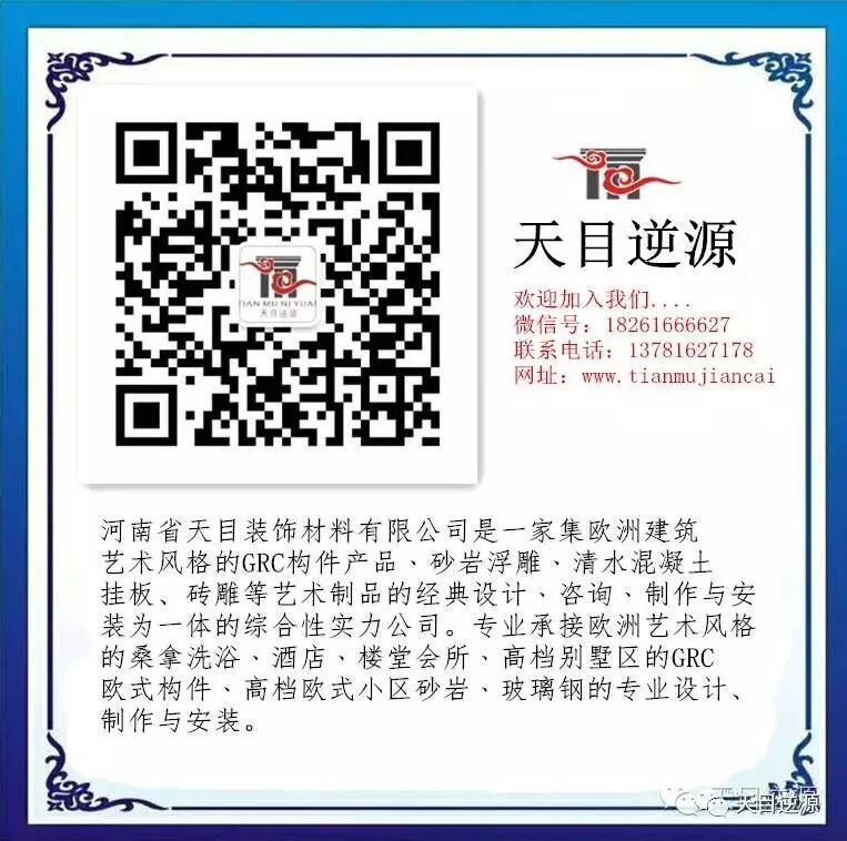 河南天目GRC水泥构件,可根据客户需要提供设计效果图。公司拥有门套、窗套、EPS线条、檐线、欧式罗马柱、浮雕、GRC构件、等一千多个品种,主要承接房地产、酒店、办公楼、园林装饰、别墅等GRC、GRP、EPS、仿砂岩、真石漆、旧房翻新工程。公司是集研发,设计,生产及施工为一体的专业型欧式装饰公司。公司经多年积累研发和生产经验,本司GRC产品具有质量可靠寿命长,不腐,不变形,无需保养的特征