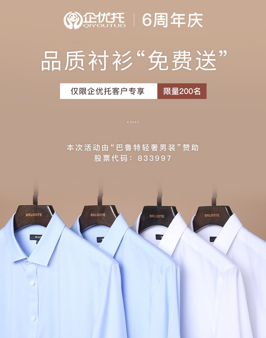 喜逢企优托集团《普天同庆6周年,千万补贴惠客户》活动,知名轻奢品牌巴鲁特联合企优托集团推出钜惠活动——“为新老客户献礼”。巴鲁特为企优托合作客户献礼,200件品质衬衫免费送,先到先得!